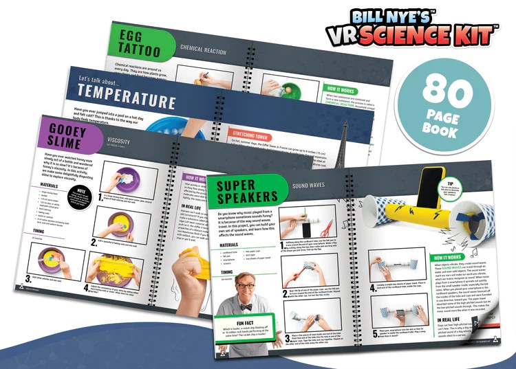 - 360 Virtual Reality: Immerse yourself in Bill Nye’s lab, fly over volcanoes, and dive into crystal caves with the included VR goggles.